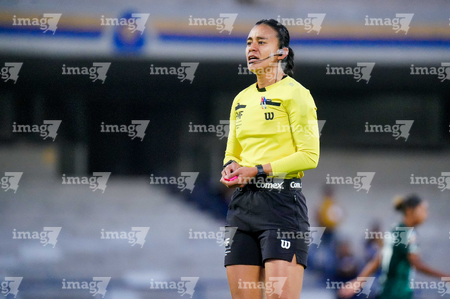 Ciudad de México, 27 de marzo de 2026. Itzel Hernández Fuentes, árbitra central, durante el partido correspondiente a la jornada 14 del torneo Clausura 2026 de la Liga BBVA MX Femenil, entre las Pumas de la UNAM y las Esmeraldas del León, realizado en el estadio Olímpico Universitario. Foto: Imago7/Diego Padilla