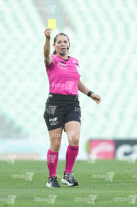 Torreón, Coahuila, 28 de marzo de 2026. Francia María González, árbitra central, muestra tarjeta amarilla de amonestación, durante el partido correspondiente a la jornada 14 del torneo Clausura 2026 de la Liga BBVA MX Femenil, entre las Guerreras de Santos Laguna y el Atlético San Luis, realizado en el estadio Corona. Foto: Imago7/