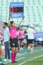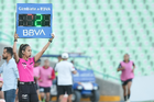 Torreón, Coahuila, 28 de marzo de 2026. María Fernanda Márquez, cuarta árbitra, con el tablero electrónico de cambios, durante el partido correspondiente a la jornada 14 del torneo Clausura 2026 de la Liga BBVA MX Femenil, entre las Guerreras de Santos Laguna y el Atlético San Luis, realizado en el estadio Corona. Foto: Imago7/