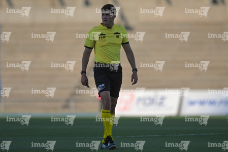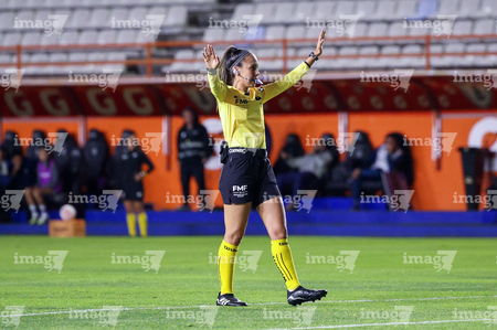 Pachuca, Hidalgo, 5 de abril de 2026. María Fernanda Márquez, árbitra central, durante el partido correspondiente a la jornada 16 del torneo Clausura 2026 de la Liga BBVA MX Femenil, entre las Tuzas del Pachuca y las Esmeraldas del León, realizado en el estadio Hidalgo. Foto: Imago7/ Jacqueline Pedraza