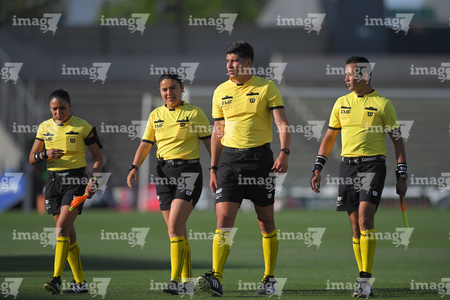 Ciudad Juárez, Chihuahua, 5 de abril de 2026. Alma Karen Martínez, árbitra asistente, Lee Fernanda Natasha Galán, cuarto árbitro, Fernando Alexis Portillo, árbitro central y Mauro Arturo Chaltel, árbitro asistente, durante el partido correspondiente a la jornada 16 del torneo Clausura 2026 de la Liga BBVA MX Femenil, entre las Bravas de FC Juárez y las Rayadas del Monterrey, realizado en realizado en el estadio Olímpico Benito Juárez. Foto: Imago7/ José Zamora