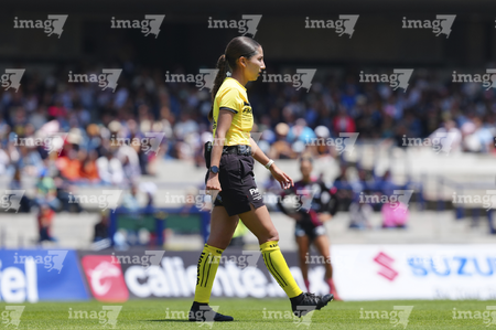 Ciudad de México, 5 de abril de 2026. Mariana Gómez Jaime, árbitra central, durante el partido correspondiente a la jornada 16 del torneo Clausura 2026 de la Liga BBVA MX Femenil, entre las Pumas de la UNAM y el Club Puebla, realizado en el estadio Olímpico Universitario. Foto: Imago7/ Manlio Contreras