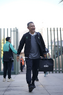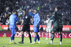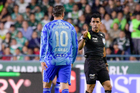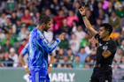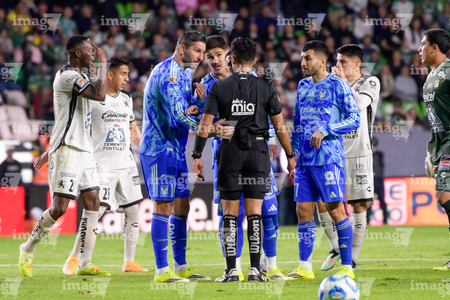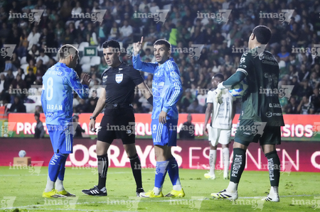 León, Guanajuato, 31 de enero de 2026. Fernando Gorriarán y Adonai Escobedo, árbitro central, durante el partido correspondiente a la jornada 4 del torneo Clausura 2026 de la Liga BBVA MX, entre los Esmeraldas del León y los Tigres de la UANL, realizado en el estadio León. Foto: Imago7/ Sebastian Laureano Miranda