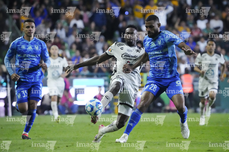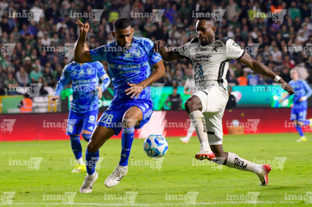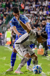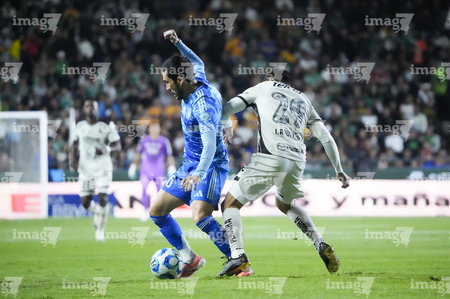 León, Guanajuato, 31 de enero de 2026. Juan Brunetta y Bryan Colula, durante el partido correspondiente a la jornada 4 del torneo Clausura 2026 de la Liga BBVA MX, entre los Esmeraldas del León y los Tigres de la UANL, realizado en el estadio León. Foto: Imago7/ Duilio Muñoz