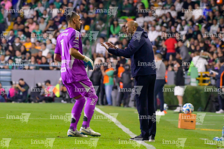 León, Guanajuato, 31 de enero de 2026. Nahuel Guzmán y Guido Pizarro, director técnico, durante el partido correspondiente a la jornada 4 del torneo Clausura 2026 de la Liga BBVA MX, entre los Esmeraldas del León y los Tigres de la UANL, realizado en el estadio León. Foto: Imago7/ Duilio Muñoz