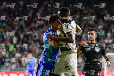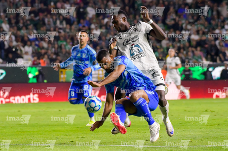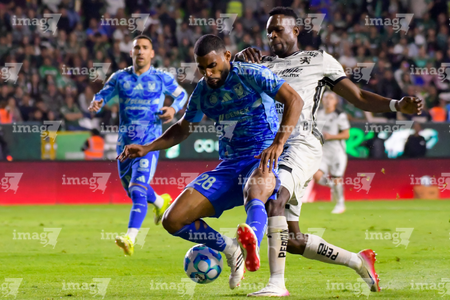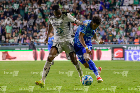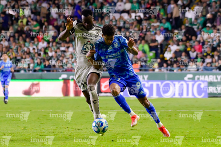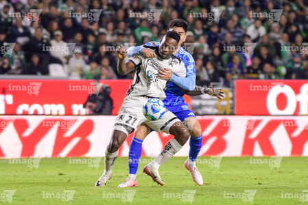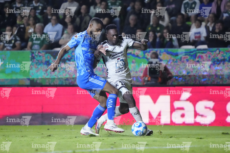 León, Guanajuato, 31 de enero de 2026. Joaquim Pereira y Diber Cambindo, durante el partido correspondiente a la jornada 4 del torneo Clausura 2026 de la Liga BBVA MX, entre los Esmeraldas del León y los Tigres de la UANL, realizado en el estadio León. Foto: Imago7/ Duilio Muñoz
