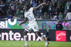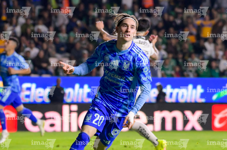 León, Guanajuato, 31 de enero de 2026. Marcelo Flores en festejo de gol, durante el partido correspondiente a la jornada 4 del torneo Clausura 2026 de la Liga BBVA MX, entre los Esmeraldas del León y los Tigres de la UANL, realizado en el estadio León. Foto: Imago7/ Sebastian Laureano Miranda