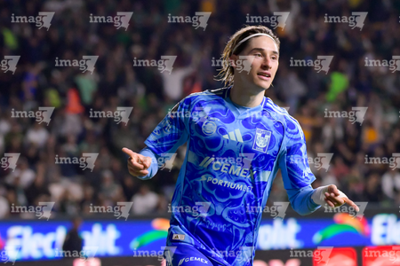 León, Guanajuato, 31 de enero de 2026. Diego Lainez en festejo de gol, durante el partido correspondiente a la jornada 4 del torneo Clausura 2026 de la Liga BBVA MX, entre los Esmeraldas del León y los Tigres de la UANL, realizado en el estadio León. Foto: Imago7/ Duilio Muñoz