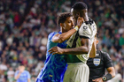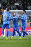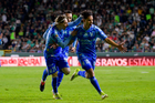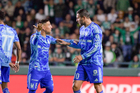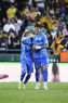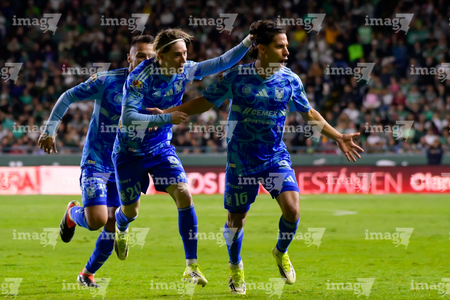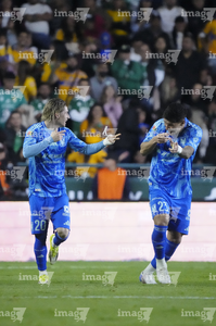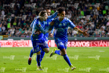 León, Guanajuato, 31 de enero de 2026. Marcelo Flores y Rômulo Zwarg en festejo de gol, durante el partido correspondiente a la jornada 4 del torneo Clausura 2026 de la Liga BBVA MX, entre los Esmeraldas del León y los Tigres de la UANL, realizado en el estadio León. Foto: Imago7/ Sebastian Laureano Miranda