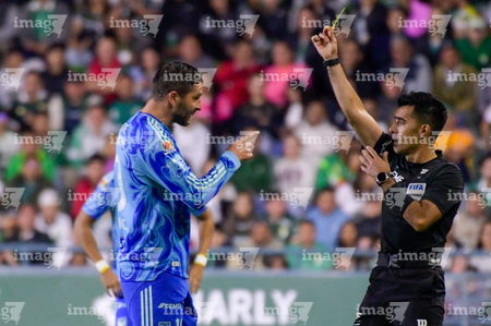León, Guanajuato, 31 de enero de 2026. Adonai Escobedo, árbitro central muestra tarjeta amarilla de amonestación a André-Pierre Gignac, durante el partido correspondiente a la jornada 4 del torneo Clausura 2026 de la Liga BBVA MX, entre los Esmeraldas del León y los Tigres de la UANL, realizado en el estadio León. Foto: Imago7/ Duilio Muñoz
