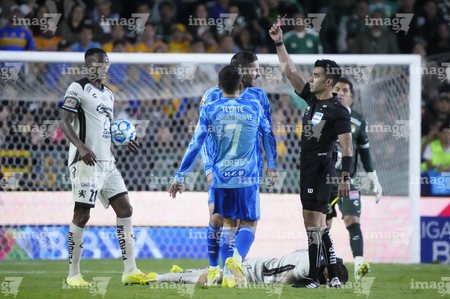 León, Guanajuato, 31 de enero de 2026. Adonai Escobedo, árbitro central, durante el partido correspondiente a la jornada 4 del torneo Clausura 2026 de la Liga BBVA MX, entre los Esmeraldas del León y los Tigres de la UANL, realizado en el estadio León. Foto: Imago7/ Duilio Muñoz