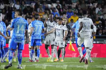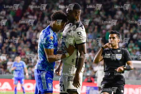León, Guanajuato, 31 de enero de 2026. Stiven Barreiro y Ozziel Herrera en conato de bronca, durante el partido correspondiente a la jornada 4 del torneo Clausura 2026 de la Liga BBVA MX, entre los Esmeraldas del León y los Tigres de la UANL, realizado en el estadio León. Foto: Imago7/ Duilio Muñoz