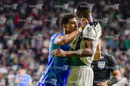 León, Guanajuato, 31 de enero de 2026. Joaquim Pereira y Diber Cambindo, durante el partido correspondiente a la jornada 4 del torneo Clausura 2026 de la Liga BBVA MX, entre los Esmeraldas del León y los Tigres de la UANL, realizado en el estadio León. Foto: Imago7/ Sebastian Laureano Miranda