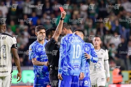 León, Guanajuato, 31 de enero de 2026. Adonai Escobedo, árbitro central muestra tarjeta roja de expulsión a André-Pierre Gignac, durante el partido correspondiente a la jornada 4 del torneo Clausura 2026 de la Liga BBVA MX, entre los Esmeraldas del León y los Tigres de la UANL, realizado en el estadio León. Foto: Imago7/