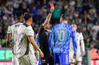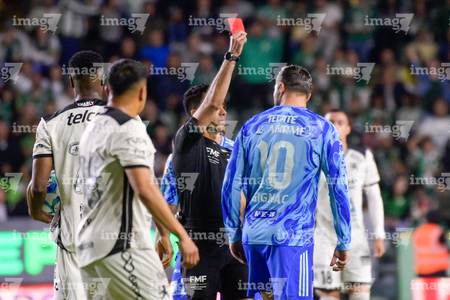 León, Guanajuato, 31 de enero de 2026. Adonai Escobedo, árbitro central muestra tarjeta roja de expulsión a André-Pierre Gignac, durante el partido correspondiente a la jornada 4 del torneo Clausura 2026 de la Liga BBVA MX, entre los Esmeraldas del León y los Tigres de la UANL, realizado en el estadio León. Foto: Imago7/ Sebastian Laureano Miranda