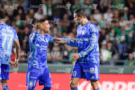 León, Guanajuato, 31 de enero de 2026. Marcelo Flores y Diego Lainez en festejo de gol, durante el partido correspondiente a la jornada 4 del torneo Clausura 2026 de la Liga BBVA MX, entre los Esmeraldas del León y los Tigres de la UANL, realizado en el estadio León. Foto: Imago7/ Duilio Muñoz