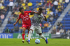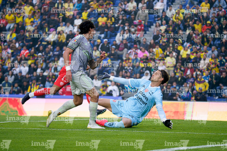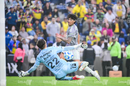 Ciudad de México, 31 de enero de 2026. Luis Unsain ataja balón a Kevin Álvarez, durante el partido correspondiente a la jornada 4 del torneo Clausura 2026 de la Liga BBVA MX, entre las Águilas del América y los Rayos del Necaxa, realizado en el estadio Ciudad de los Deportes. Foto: Imago7/ Diego Padilla