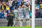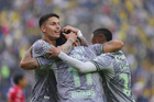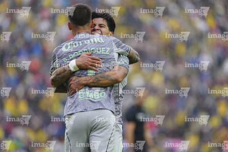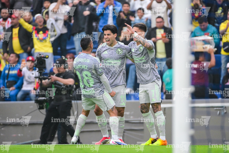 Ciudad de México, 31 de enero de 2026. Erick Sánchez, Víctor Dávila y Brian Rodríguez en festejo de gol, durante el partido correspondiente a la jornada 4 del torneo Clausura 2026 de la Liga BBVA MX, entre las Águilas del América y los Rayos del Necaxa, realizado en el estadio Ciudad de los Deportes. Foto: Imago7/ Alexis Chavez