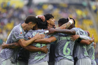 Ciudad de México, 31 de enero de 2026. Jugadores del Club América en festejo de gol, durante el partido correspondiente a la jornada 4 del torneo Clausura 2026 de la Liga BBVA MX, entre las Águilas del América y los Rayos del Necaxa, realizado en el estadio Ciudad de los Deportes. Foto: Imago7/ Manlio Contreras