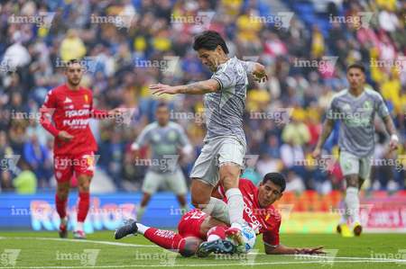 Ciudad de México, 31 de enero de 2026. Israel Tello y Jonathan Dos Santos, durante el partido correspondiente a la jornada 4 del torneo Clausura 2026 de la Liga BBVA MX, entre las Águilas del América y los Rayos del Necaxa, realizado en el estadio Ciudad de los Deportes. Foto: Imago7/ Manlio Contreras