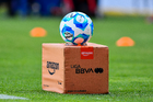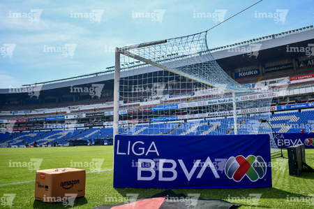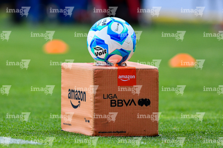 Querétaro, Querétaro, 1 de febrero de 2026. Balón de futbol Voit Aereus sobre caja de Amazon, durante el partido correspondiente a la jornada 4 del torneo Clausura 2026 de la Liga BBVA MX, entre los Gallos Blancos del Querétaro y los Tuzos del Pachuca, realizado en el estadio La Corregidora. Foto: Imago7/ Olimpia Puga