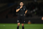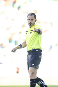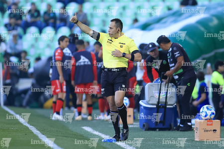 Guadalupe, Nuevo León, 14 de febrero de 2026. Fernando Hernández, árbitro central, durante el partido correspondiente a la jornada 6 del torneo Clausura 2026 de la Liga BBVA MX, entre los Rayados del Monterrey y los Esmeraldas del León, realizado en el estadio BBVA. Foto: Imago7/Sebastian Laureano Miranda