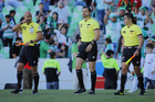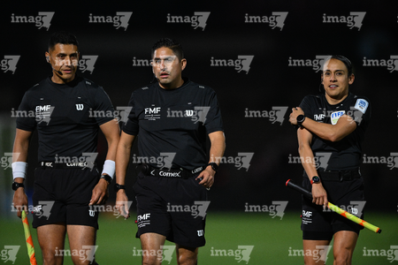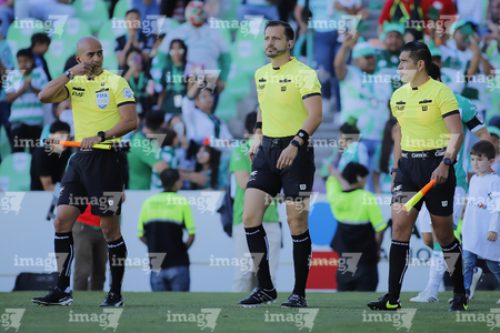 Ciudad Juárez, Chihuahua, 14 de febrero de 2026. Jesús Lorenzo Soto, árbitro asistente, Oscar Mejía, árbitro central y Sandra Elizabeth Ramírez, árbitra asistente, durante el partido correspondiente a la jornada 6 del torneo Clausura 2026 de la Liga BBVA MX, entre los Bravos de FC Juárez y los Rayos del Necaxa, realizado en realizado en el estadio Olímpico Benito Juárez. Foto: Imago7/ José Zamora