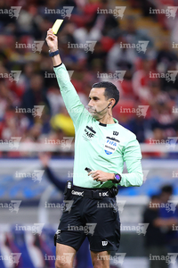 Zapopan, Jalisco, 14 de febrero de 2026. César Arturo Ramos, árbitro central muestra tarjeta amarilla de amonestación, durante el partido correspondiente a la jornada 6 del torneo Clausura 2026 de la Liga BBVA MX, entre las Chivas Rayadas del Guadalajara y las Águilas del América, realizado en el estadio Akron. Foto: Imago7/Cristian Hernandez