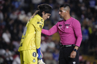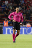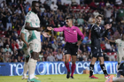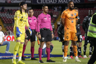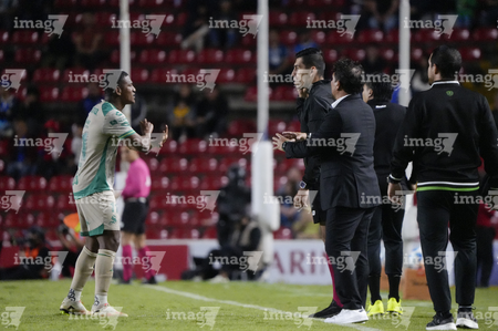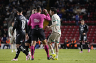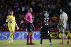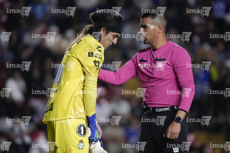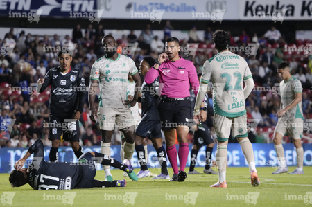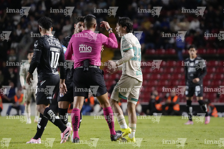 Querétaro, Querétaro, 27 de febrero de 2025. Carlos Acevedo Abraham de Jesús Quirarte, árbitro central y Guillermo Allison, durante el partido correspondiente a la jornada 8 del torneo Clausura 2026 de la Liga BBVA MX, entre los Gallos Blancos del Querétaro y los Guerreros de Santos Laguna, realizado en el estadio La Corregidora. Foto: Imago7/Sebastian Laureano Miranda