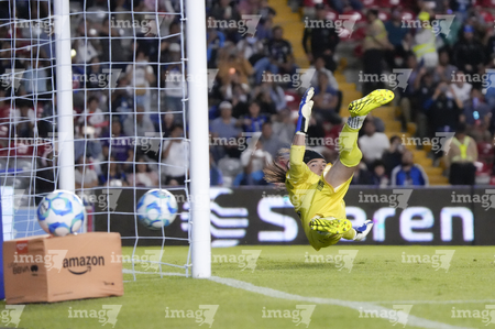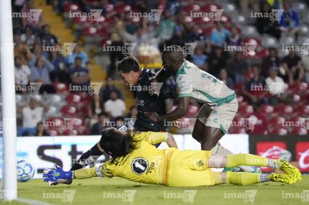 Querétaro, Querétaro, 27 de febrero de 2025. Mateo Coronel anota gol a Carlos Acevedo, durante el partido correspondiente a la jornada 8 del torneo Clausura 2026 de la Liga BBVA MX, entre los Gallos Blancos del Querétaro y los Guerreros de Santos Laguna, realizado en el estadio La Corregidora. Foto: Imago7/Sebastian Laureano Miranda