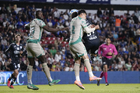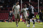 Querétaro, Querétaro, 27 de febrero de 2025. Lucca Vuoso en conato de bronca, durante el partido correspondiente a la jornada 8 del torneo Clausura 2026 de la Liga BBVA MX, entre los Gallos Blancos del Querétaro y los Guerreros de Santos Laguna, realizado en el estadio La Corregidora. Foto: Imago7/Sebastian Laureano Miranda