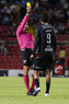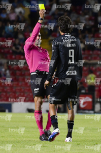Querétaro, Querétaro, 27 de febrero de 2025. Abraham de Jesús Quirarte, árbitro central muestra tarjeta amarilla de amonestación a Diego Reyes, durante el partido correspondiente a la jornada 8 del torneo Clausura 2026 de la Liga BBVA MX, entre los Gallos Blancos del Querétaro y los Guerreros de Santos Laguna, realizado en el estadio La Corregidora. Foto: Imago7/ Duilio Muñoz