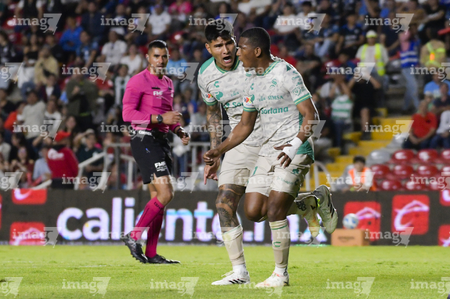 Querétaro, Querétaro, 27 de febrero de 2025. Bruno Amione y Carlos Gruezo en festejo de gol, durante el partido correspondiente a la jornada 8 del torneo Clausura 2026 de la Liga BBVA MX, entre los Gallos Blancos del Querétaro y los Guerreros de Santos Laguna, realizado en el estadio La Corregidora. Foto: Imago7/ Duilio Muñoz