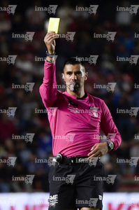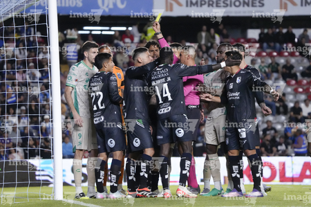 Querétaro, Querétaro, 27 de febrero de 2025. Abraham de Jesús Quirarte, árbitro central muestra tarjeta amarilla de amonestación, durante el partido correspondiente a la jornada 8 del torneo Clausura 2026 de la Liga BBVA MX, entre los Gallos Blancos del Querétaro y los Guerreros de Santos Laguna, realizado en el estadio La Corregidora. Foto: Imago7/ Duilio Muñoz