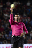 Querétaro, Querétaro, 27 de febrero de 2025. Abraham de Jesús Quirarte, árbitro central muestra tarjeta amarilla de amonestación, durante el partido correspondiente a la jornada 8 del torneo Clausura 2026 de la Liga BBVA MX, entre los Gallos Blancos del Querétaro y los Guerreros de Santos Laguna, realizado en el estadio La Corregidora. Foto: Imago7/Sebastian Laureano Miranda