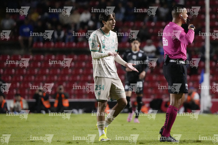 Querétaro, Querétaro, 27 de febrero de 2025. Carlos Acevedo y Abraham de Jesús Quirarte, árbitro central, durante el partido correspondiente a la jornada 8 del torneo Clausura 2026 de la Liga BBVA MX, entre los Gallos Blancos del Querétaro y los Guerreros de Santos Laguna, realizado en el estadio La Corregidora. Foto: Imago7/Sebastian Laureano Miranda