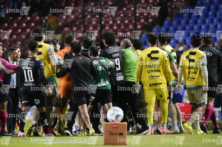 Querétaro, Querétaro, 27 de febrero de 2025. Jugadores del Santos Laguna y Jugadores de Querétaro en conato de bronca, durante el partido correspondiente a la jornada 8 del torneo Clausura 2026 de la Liga BBVA MX, entre los Gallos Blancos del Querétaro y los Guerreros de Santos Laguna, realizado en el estadio La Corregidora. Foto: Imago7/Sebastian Laureano Miranda