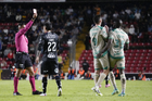 Querétaro, Querétaro, 27 de febrero de 2025. Jugadores del Santos Laguna en reclamo a Abraham de Jesús Quirarte, árbitro central, durante el partido correspondiente a la jornada 8 del torneo Clausura 2026 de la Liga BBVA MX, entre los Gallos Blancos del Querétaro y los Guerreros de Santos Laguna, realizado en el estadio La Corregidora. Foto: Imago7/Sebastian Laureano Miranda
