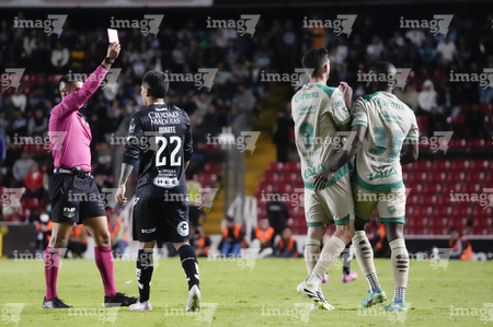 Querétaro, Querétaro, 27 de febrero de 2025. Abraham de Jesús Quirarte, árbitro central muestra tarjeta roja de expulsión a Lucas Di Yorio, durante el partido correspondiente a la jornada 8 del torneo Clausura 2026 de la Liga BBVA MX, entre los Gallos Blancos del Querétaro y los Guerreros de Santos Laguna, realizado en el estadio La Corregidora. Foto: Imago7/Sebastian Laureano Miranda