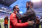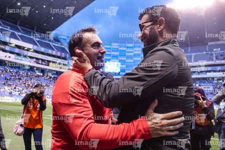 Puebla, Puebla, 3 de abril de 2026. José Belman, auxiliar técnico y Albert Espigares, director técnico, durante el partido correspondiente a la jornada 13 del torneo Clausura 2026 de la Liga BBVA MX, entre el Club Puebla y los Bravos de FC Juárez, realizado en el estadio Cuauhtémoc. Foto: Imago7/ Diego Alducin