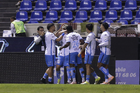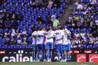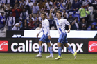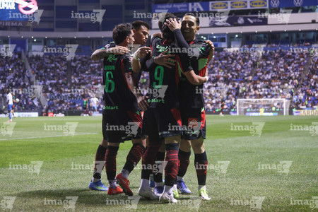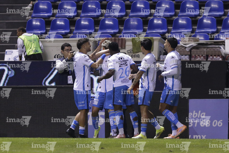 Puebla, Puebla, 3 de abril de 2026. Jugadores del Puebla en festejo de gol, durante el partido correspondiente a la jornada 13 del torneo Clausura 2026 de la Liga BBVA MX, entre el Club Puebla y los Bravos de FC Juárez, realizado en el estadio Cuauhtémoc. Foto: Imago7/Mireya Novo