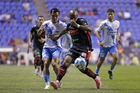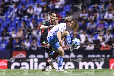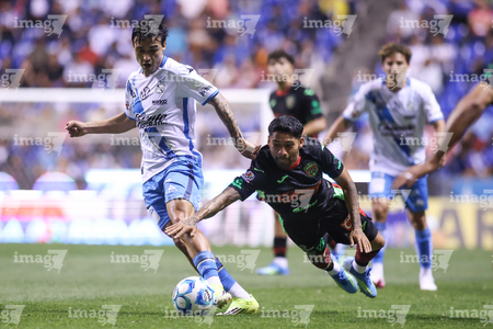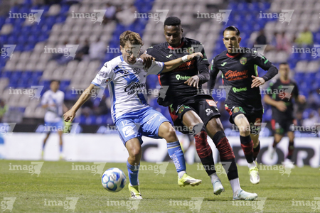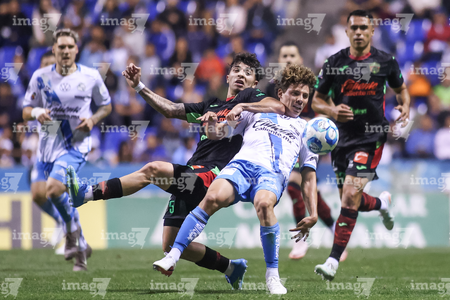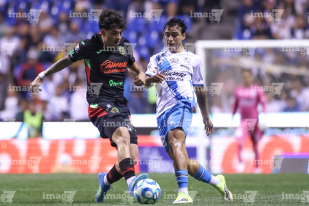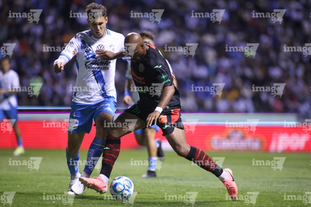 Puebla, Puebla, 3 de abril de 2026. Denzell García y Alejandro Organista, durante el partido correspondiente a la jornada 13 del torneo Clausura 2026 de la Liga BBVA MX, entre el Club Puebla y los Bravos de FC Juárez, realizado en el estadio Cuauhtémoc. Foto: Imago7/ Diego Alducin
