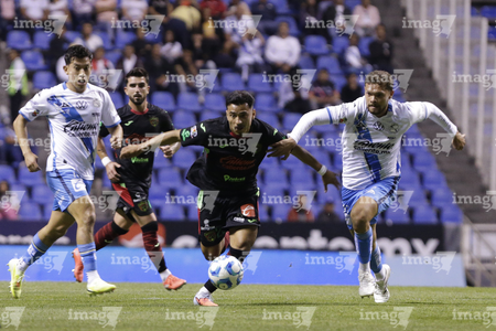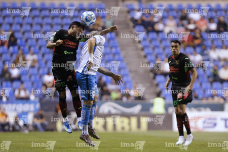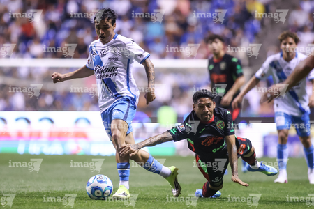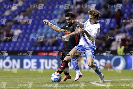 Puebla, Puebla, 3 de abril de 2026. Jairo Torres y Eduardo Navarro, durante el partido correspondiente a la jornada 13 del torneo Clausura 2026 de la Liga BBVA MX, entre el Club Puebla y los Bravos de FC Juárez, realizado en el estadio Cuauhtémoc. Foto: Imago7/Mireya Novo