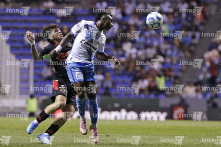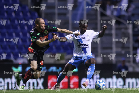Puebla, Puebla, 3 de abril de 2026. Oscar Estupiñan y Juan Vargas, durante el partido correspondiente a la jornada 13 del torneo Clausura 2026 de la Liga BBVA MX, entre el Club Puebla y los Bravos de FC Juárez, realizado en el estadio Cuauhtémoc. Foto: Imago7/Mireya Novo