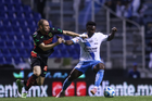 Puebla, Puebla, 3 de abril de 2026. Denzell García y Fernando Monárrez, durante el partido correspondiente a la jornada 13 del torneo Clausura 2026 de la Liga BBVA MX, entre el Club Puebla y los Bravos de FC Juárez, realizado en el estadio Cuauhtémoc. Foto: Imago7/ Diego Alducin