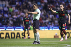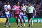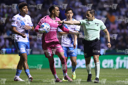 Puebla, Puebla, 3 de abril de 2026. Fernando Monarrez en reclamo, durante el partido correspondiente a la jornada 13 del torneo Clausura 2026 de la Liga BBVA MX, entre el Club Puebla y los Bravos de FC Juárez, realizado en el estadio Cuauhtémoc. Foto: Imago7/ Diego Alducin