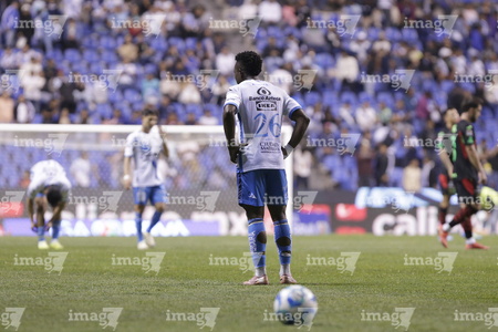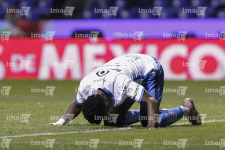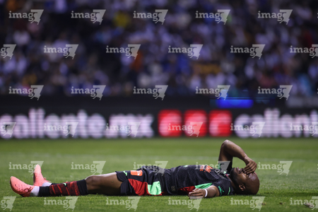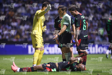 Puebla, Puebla, 3 de abril de 2026. Oscar Estupiñan resultó lesionado, durante el partido correspondiente a la jornada 13 del torneo Clausura 2026 de la Liga BBVA MX, entre el Club Puebla y los Bravos de FC Juárez, realizado en el estadio Cuauhtémoc. Foto: Imago7/ Diego Alducin