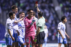 Puebla, Puebla, 3 de abril de 2026. Mario Terrazas Chávez, árbitro central, muestra tarjeta roja de expulsión a Nicolás Díaz, durante el partido correspondiente a la jornada 13 del torneo Clausura 2026 de la Liga BBVA MX, entre el Club Puebla y los Bravos de FC Juárez, realizado en el estadio Cuauhtémoc. Foto: Imago7/ Diego Alducin