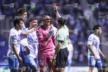 Puebla, Puebla, 3 de abril de 2026. Jugadores del Puebla en reclamo a Mario Terrazas Chávez, árbitro central, durante el partido correspondiente a la jornada 13 del torneo Clausura 2026 de la Liga BBVA MX, entre el Club Puebla y los Bravos de FC Juárez, realizado en el estadio Cuauhtémoc. Foto: Imago7/ Diego Alducin