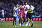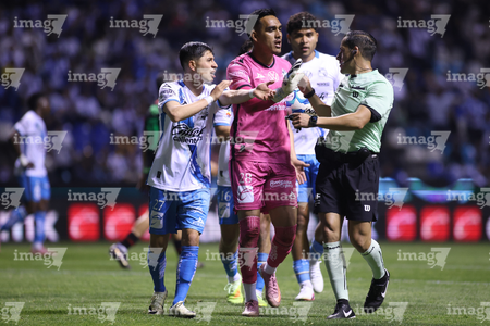 Puebla, Puebla, 3 de abril de 2026. Sebastian Jurado en reclamo a Mario Terrazas Chávez, árbitro central, durante el partido correspondiente a la jornada 13 del torneo Clausura 2026 de la Liga BBVA MX, entre el Club Puebla y los Bravos de FC Juárez, realizado en el estadio Cuauhtémoc. Foto: Imago7/ Diego Alducin
